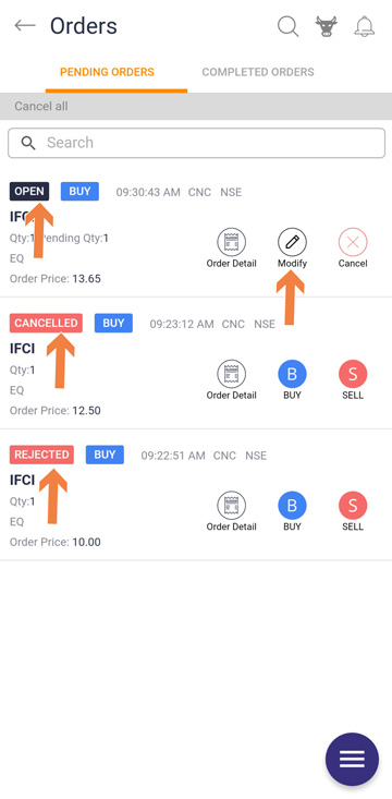 - Modify means you can modify your order w.r.t quantity, order type, MIS /CNC, Day, or IOC.